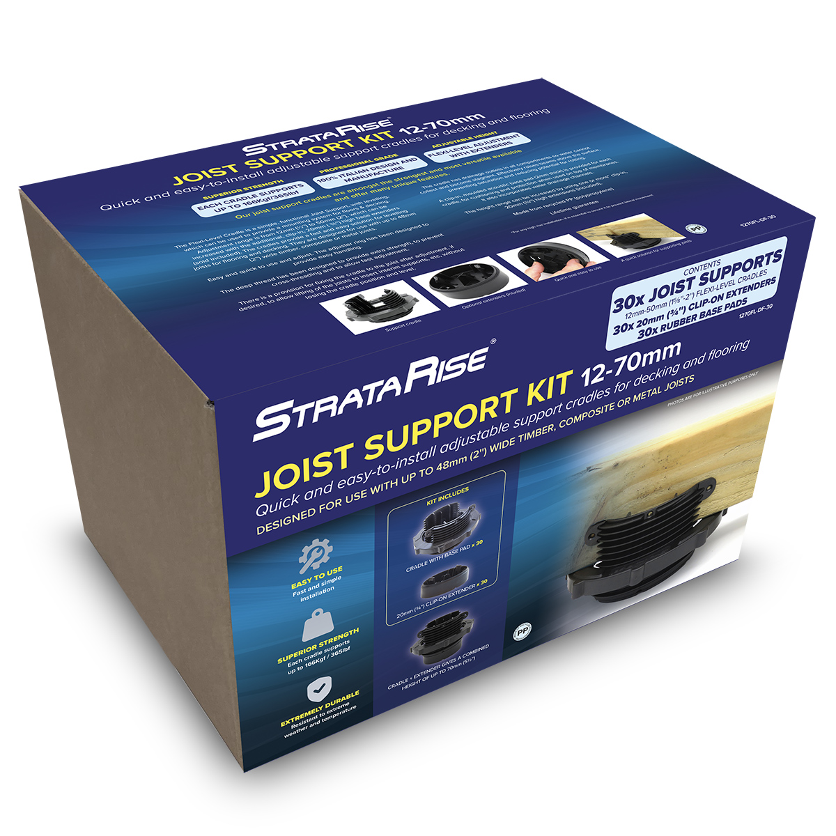 The Flexi-Level Cradle is a simple, functional height adjustable Joist Support, supplied with a clip-in rubber base pad, which can be used to provide a mounting system for floors & decking. Adjustment range is from ½" (12mm) to 2" (50mm), which can be increased with optional, clip-in, ¾" (20mm) high base extenders (sold separately). The cradles provide a fast and easy solution for levelling joists for flooring and decking. They are designed for use with up to 2 inch wide timber, metal or composite joists.